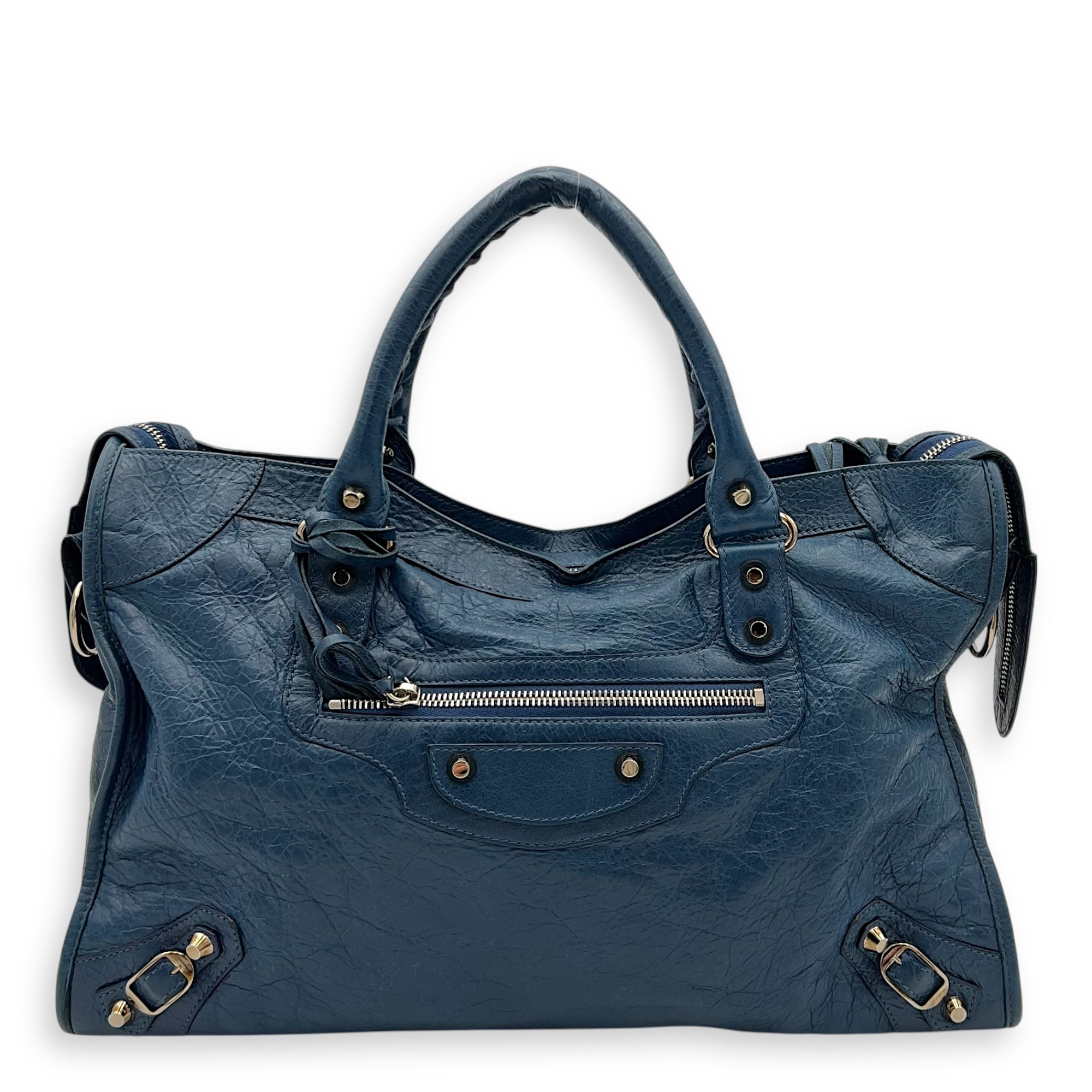 City Medium Blue Top Handle Bag in Distressed Leather, Gold hardware
