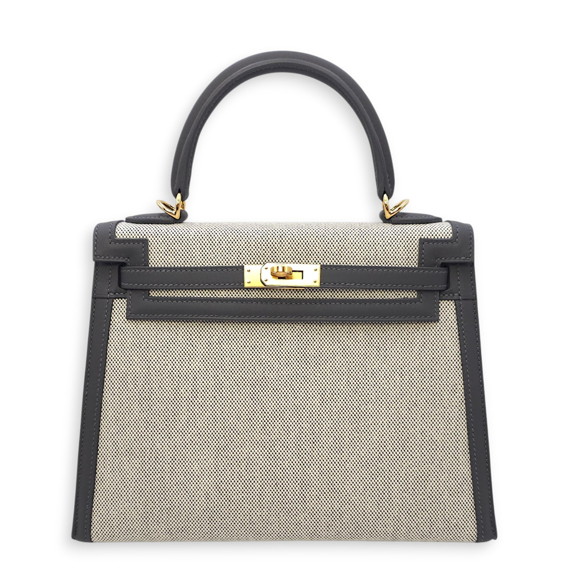 Sellier Kelly 25 Ecru-Ardoise/Ardoise in Toile/Swift Gold hardware